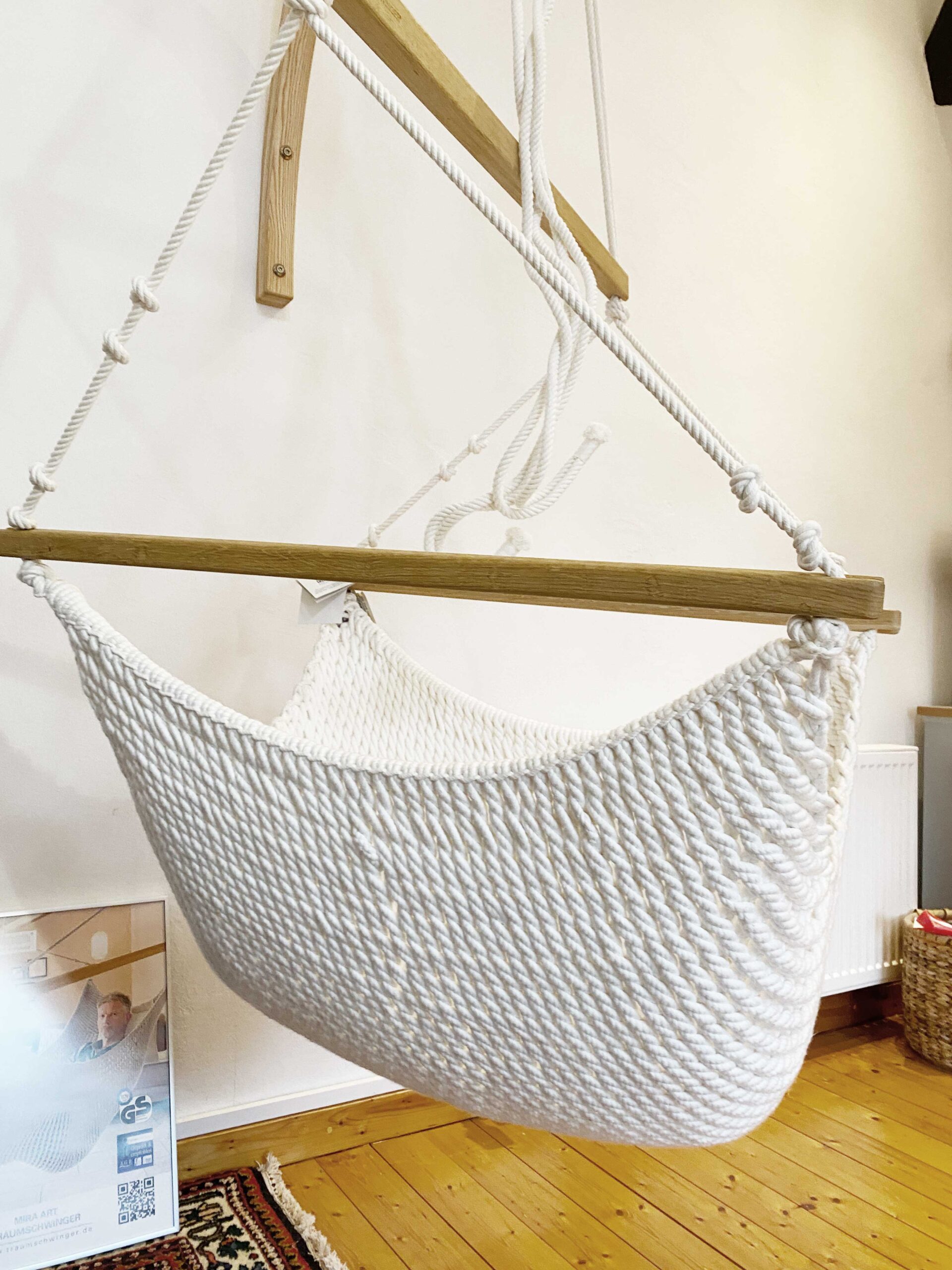 Vorführmodell – 2. Wahl – Babyschwinger Set – Netzfarbe natur, Holz unbehandelt, Seiltasche natur